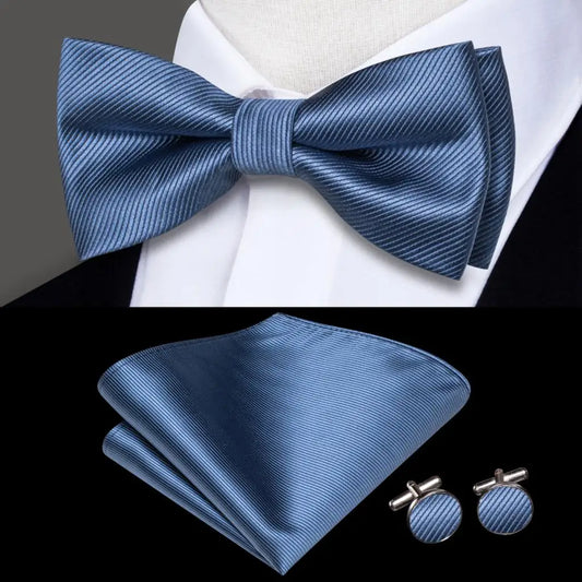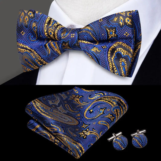 Browse our collection of blue jacquard woven silk bow ties. Our range of bow ties all come with matching cuff links and pocket square.