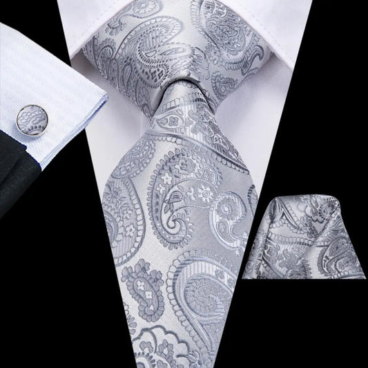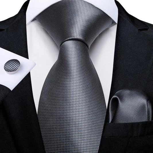 Our stunning collection of grey jacquard woven silk ties are perfect for adding a touch of class to your outfit. Crafted from high-quality silk, these ties feature intricate patterns and a luxurious texture. In addition to the silk tie, you will also receive matching cuff links and pocket square.