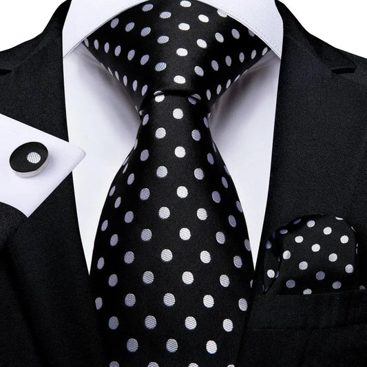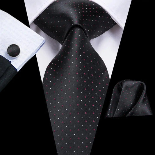 Our stunning collection of polka dot patterned jacquard woven silk ties are perfect for adding a touch of class to your outfit. Crafted from high-quality silk, these ties feature intricate patterns and a luxurious texture. In addition to the silk tie, you will also receive matching cuff links and pocket square.