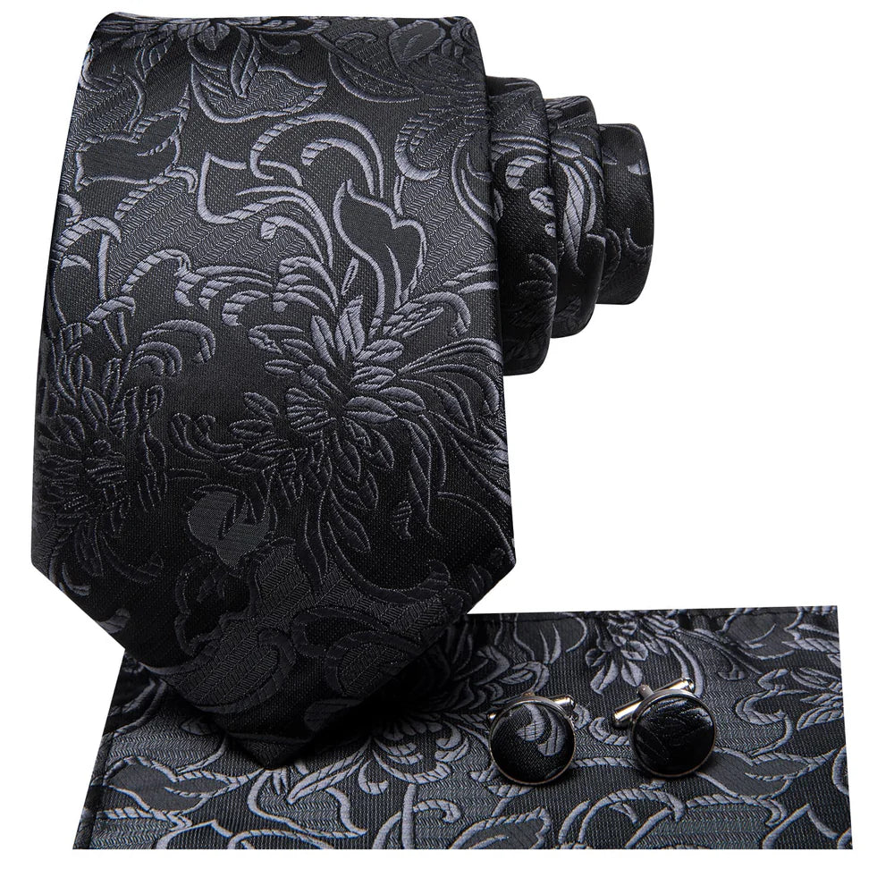 Black Floral Design Silk Tie - With Matching Cufflinks & Pocket Square