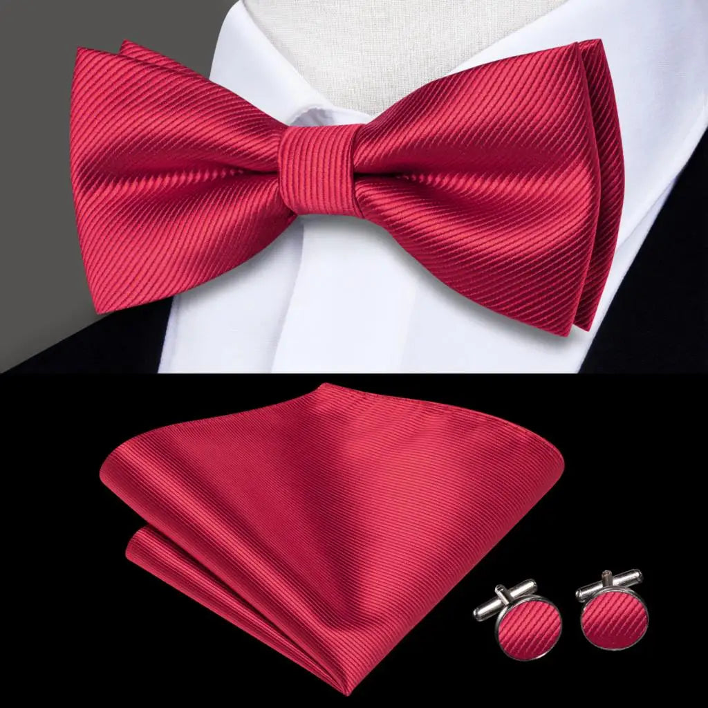 This bow tie comes complete with a matching pocket square and cuff links, creating a cohesive and polished look.