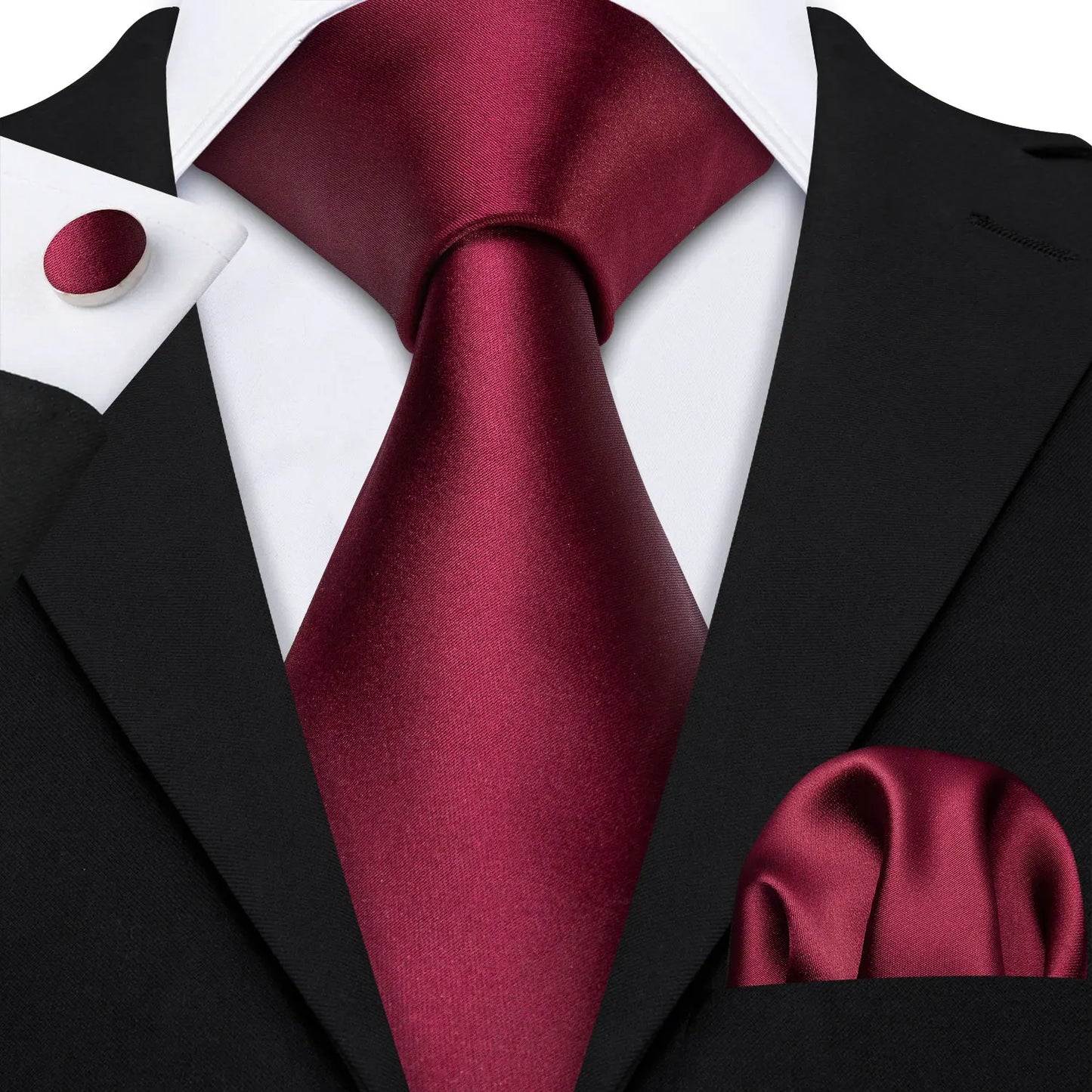 This tie comes complete with a matching pocket square and cuff links, creating a cohesive and polished look.