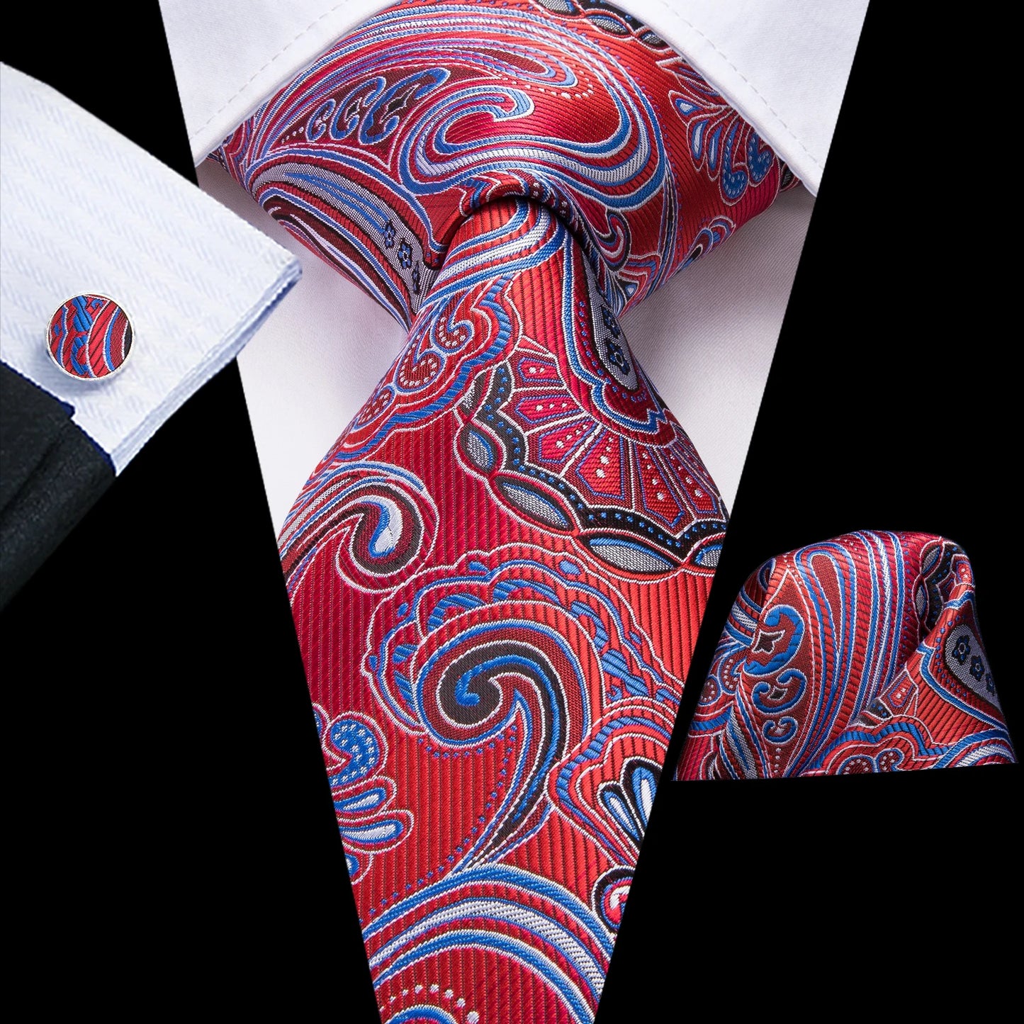 This tie comes complete with a matching pocket square and cuff links, creating a cohesive and polished look.
